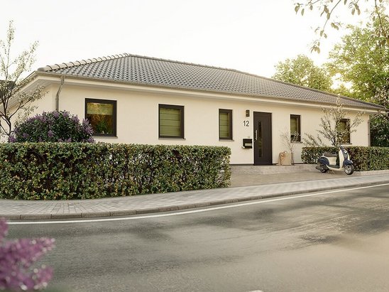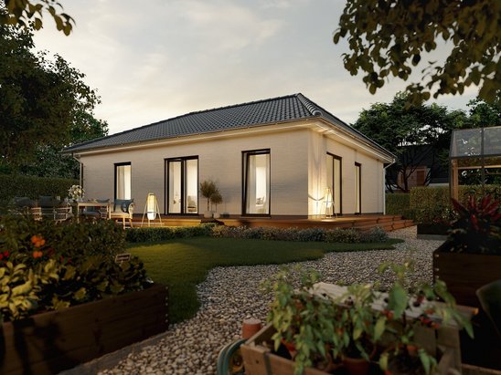 Effizienter Bungalow 110 mit Photovoltaik-Anlage auf dem Walmdach, moderner Terrasse und grünem GartenModerne Terrasse des Bungalow 110 von Town & Country Haus mit Sitzgruppe, bodentiefen Fenstern und gepflegter GartenanlageIndividuell gestalteter Bungalow 110 mit zweifarbigem Fassadenputz, großzügigen Fensterfronten und praktischem WinkelKlassischer Bungalow 110 von Town & Country Haus mit gepflegtem Gartenweg, farbenfrohen Blumen und bodentiefer FensterfrontBungalow 110 mit klarer Fassadengestaltung, Walmdach und attraktivem Vorgarten – Blick von der Straße