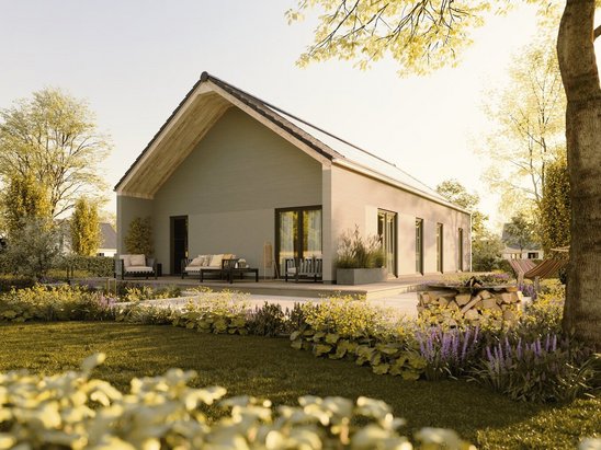 Alles auf einer Ebene – der Bungalow 110 bietet Platz für die ganze Familie: hell, gemütlich, mit direktem Gartenzugang und charaktervollem Walmdach. Ideal für gemeinsames und stufenloses Wohnen.