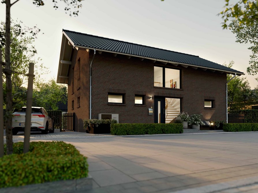 Das Landhaus 142 Modern Süd mit Klinker verbindet eine ausdrucksstarke Dacharchitektur mit einer langlebigen und hochwertigen Klinkerfassade. Der breite Dachüberstand prägt das Erscheinungsbild des Hauses und schützt die Fassade zuverlässig vor Witterungseinflüssen.