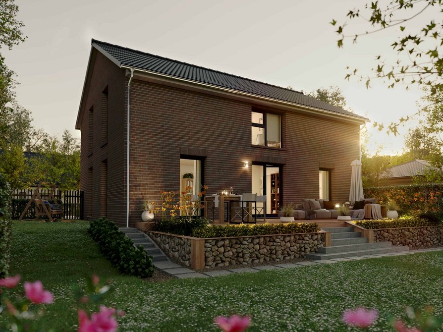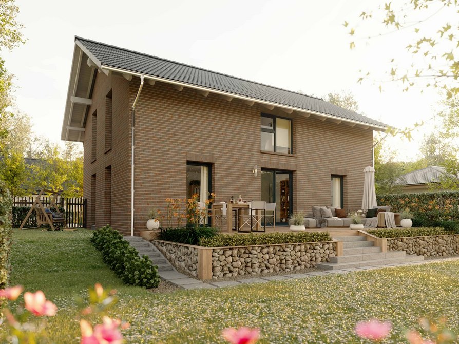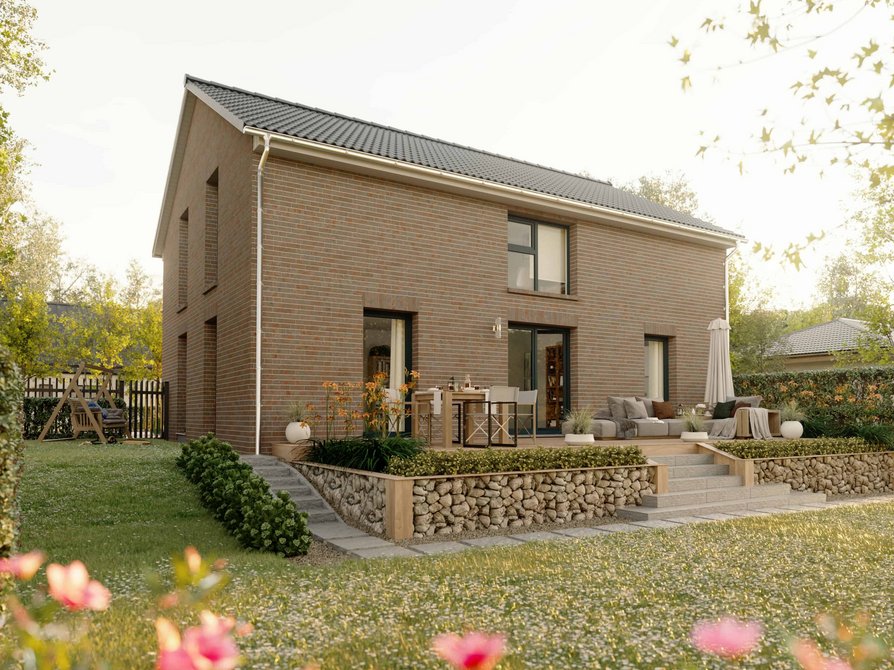Das Landhaus 142 Modern in der Variante Klinker vereint die charmante Form des Landhauses mit einer hochwertigen Klinkerfassade. Die robuste Bauweise sorgt für eine langlebige und wertige Außenwirkung und verleiht dem Haus einen besonders charaktervollen Stil.