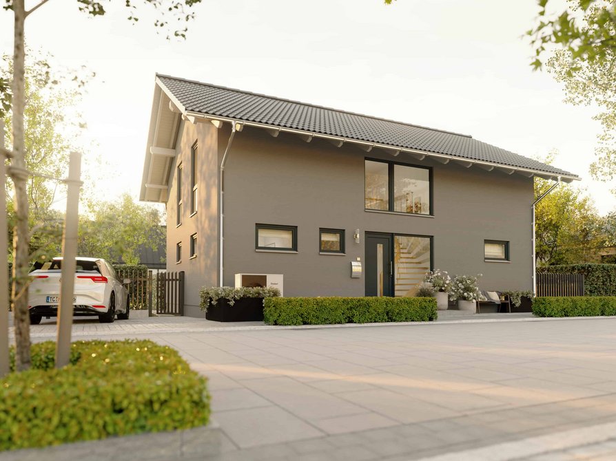 Das Landhaus 142 Modern in der Variante Süd setzt einen besonderen Akzent mit seinem markanten Dach und dem großzügigen Dachüberstand. Der weit auskragende Dachüberstand schützt Fassade und Eingangsbereich und verleiht dem Haus eine klassische und zugleich sehr prägnante Landhausoptik.